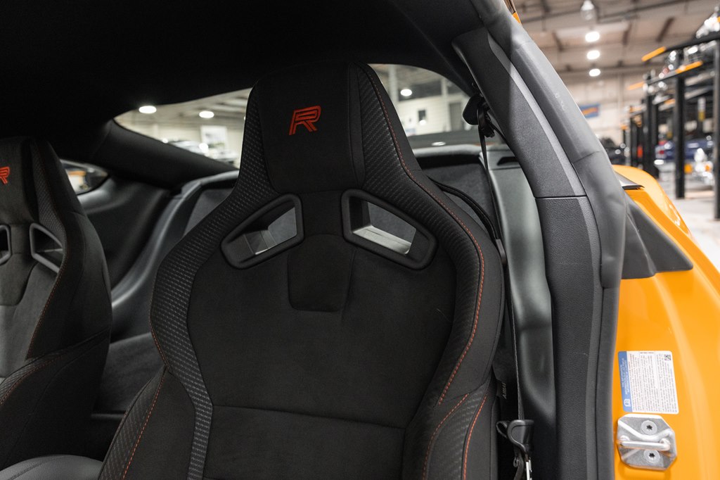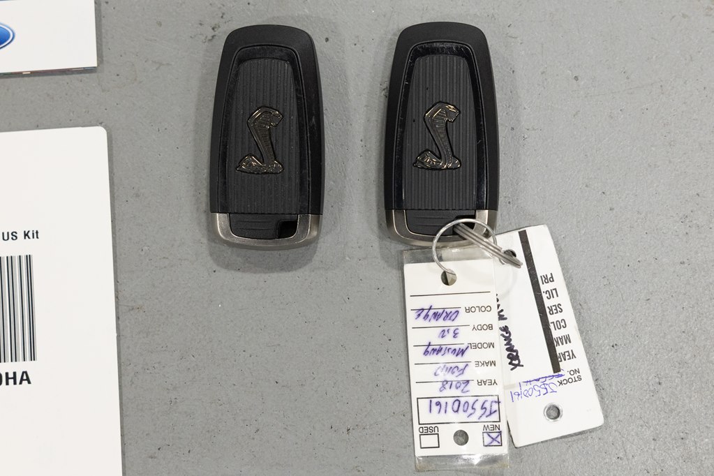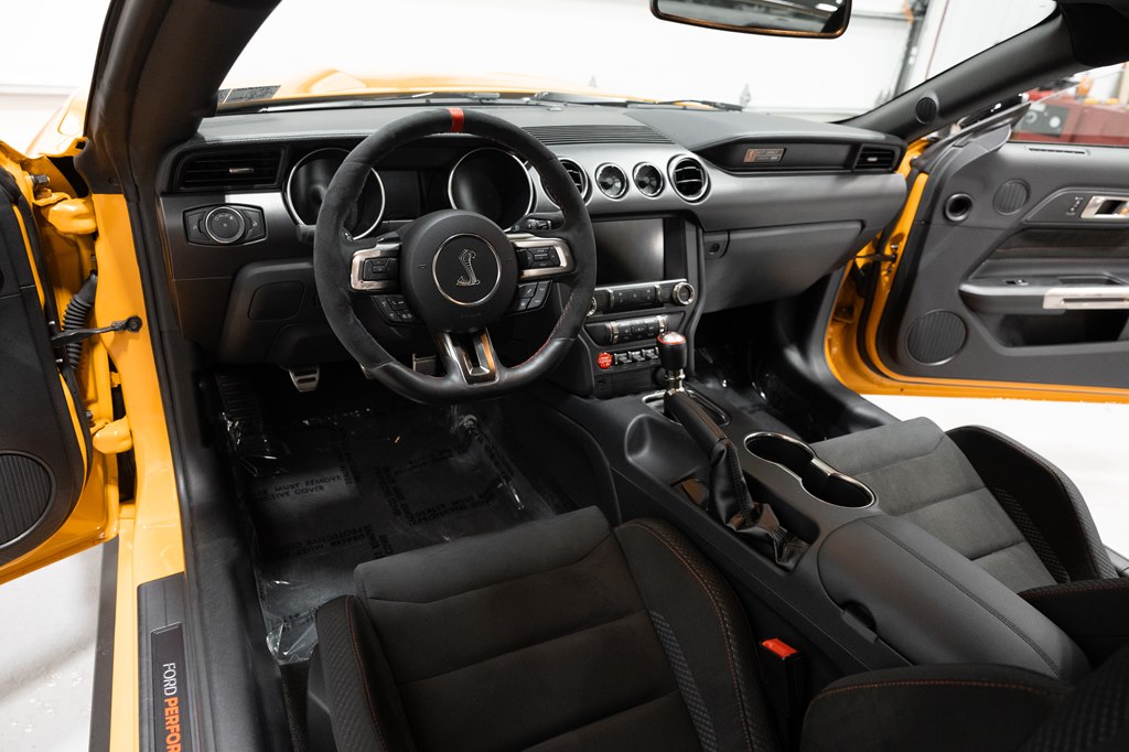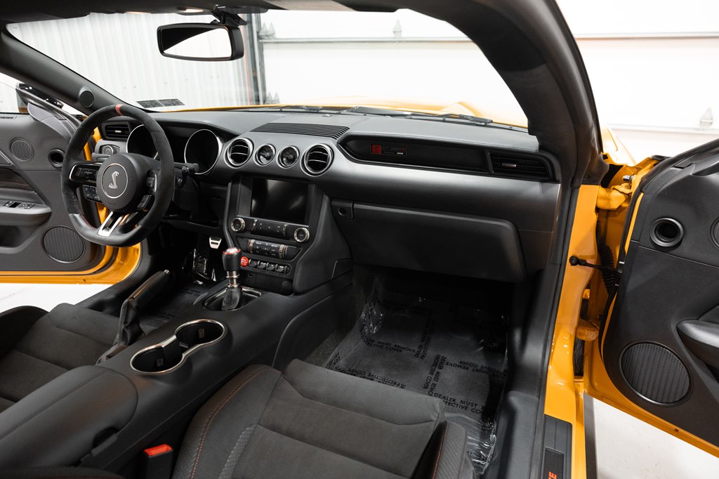 Offered for sale is this 2018 Ford Mustang GT 350 R, finished in Orange Fury Metallic Tri-Coat over a black interior, powered by a 5.2-liter 8-cylinder engine running power to the rear wheels through a 6-speed manual transmission, with 2,196 miles on the odometer as of this writing. Starting with the very first Mustangs in the 1960’s, the GT 350 model has been the driving enthusiast specification. For this 2018 S550 chassis, that starts with the ”Voodoo” engine, a 526hp, naturally aspirated DOHC 32-valve V8 with a flat-plane crank, an 8,250 rpm redline, and is mated to a Tremec TR-3160 six-speed manual transmission. Chassis upgrades include aluminum suspension assemblies with stiffer bushings, larger anti-roll bars, Brembo six-piston front brakes with 15.5-inch rotors, and a stiffer body shell. This ”R” spec GT350, tuned more for the track then the base model, adds stiffer suspension settings, more aggressive aero for better downforce, higher capacity oil and water cooling, and a less restrictive exhaust. This is a collector grade example in the rare Orange Fury finish, with only 44 produced with no center stripe. Maintenance records show eight oil changes, one for every year since new, despite the low mileage. PPF protection covers every exterior surface but the roof and the rear spoiler, and the finish is excellent. Extra equipment in the sale includes the full (and never installed) rear seat installation kit, and the commemorative kit given to every GT350 owner.